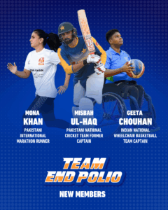 Meet the newest members of Team End Polio! Cricket legend, Misbah-ul-Haq. India’s women’s wheelchair basketball team captain, Geeta Chouhan. International marathoner, Mona Khan.
